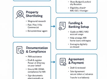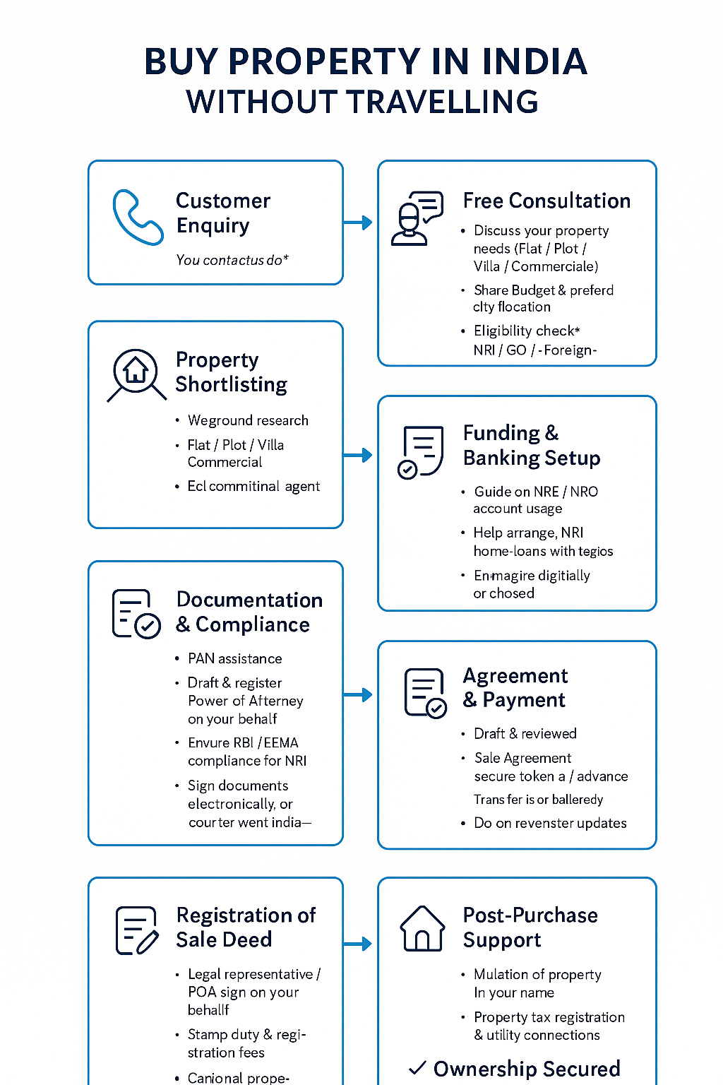Our platform offers virtual site visits, legal assistance, and a network of verified service providers, ensuring a hassle-free property investment experience for NRIs from anywhere in the world.